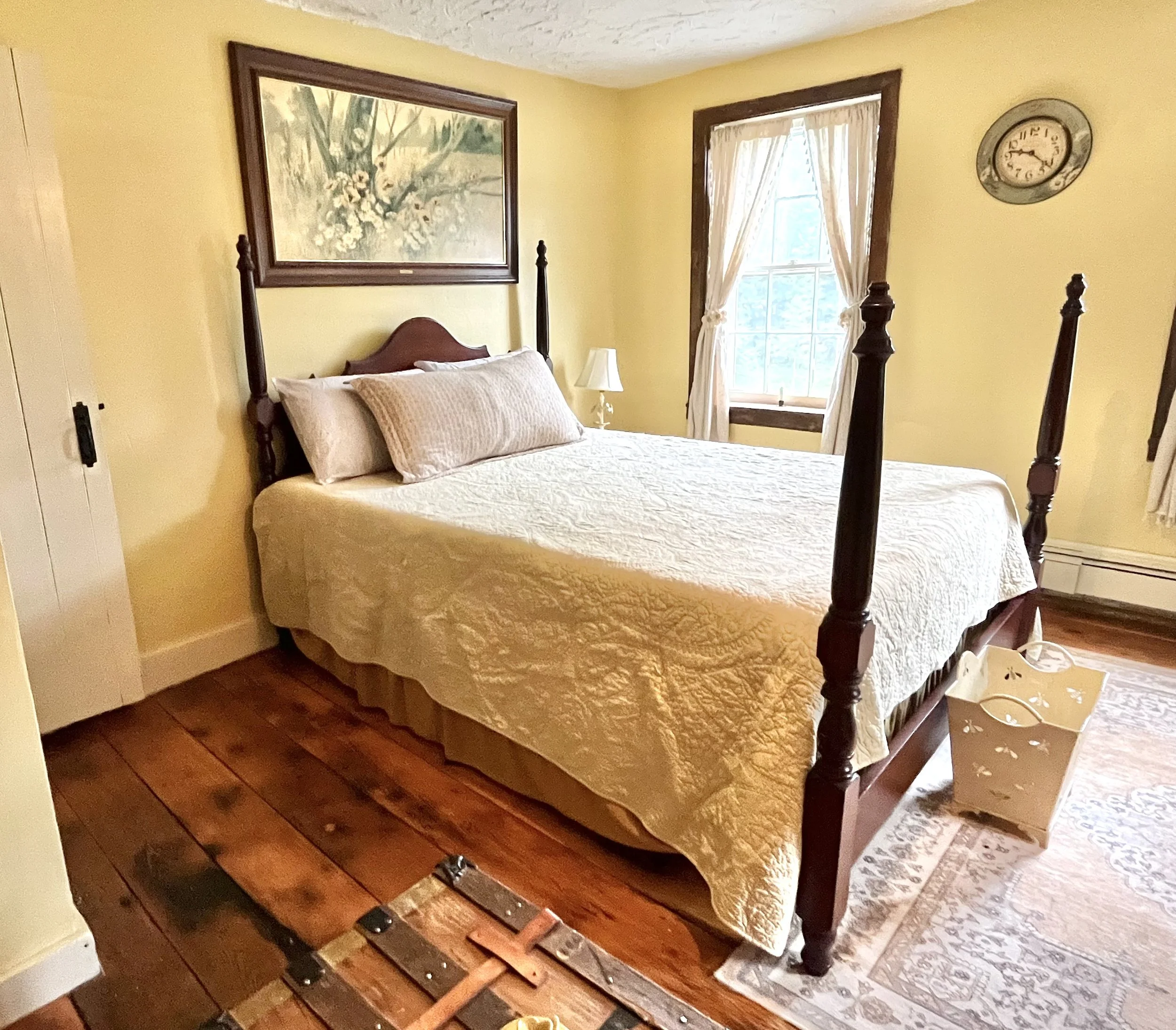 Enjoy getting ready in the vanity overlooking the yard or find yourself reading a book at the antique settee. You are sure to have the sweetest dreams in this “peace yellow” painted room. (and yes that was the name of the paint color)